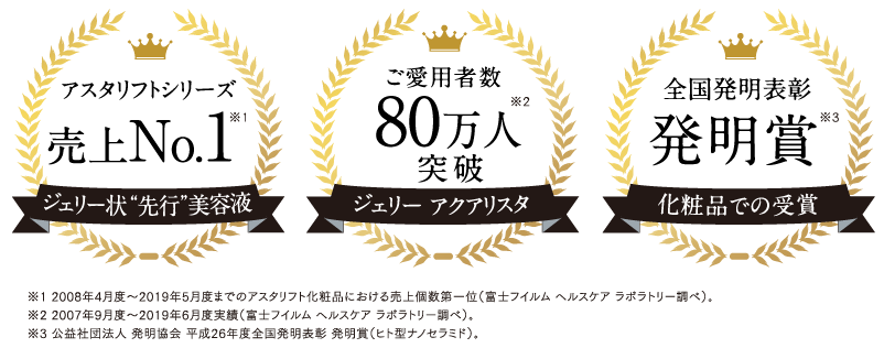 [1] 2008年4月度~2019年5月度までのアスタリフト化粧品における売上個数第一位(富士フイルム ヘルスケア ラボラトリー調べ)。