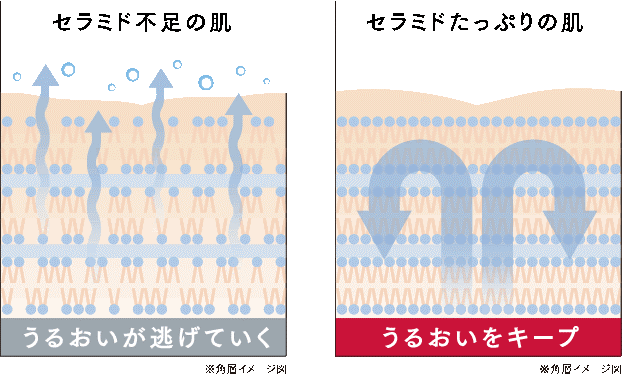 セラミドは、私たちの肌に元々存在し、内側の水分をキープしてくれるとっても大切な成分。ここ最近では保湿成分としてかなり話題になっている、いわば「うるおい肌のカギ」なんです。