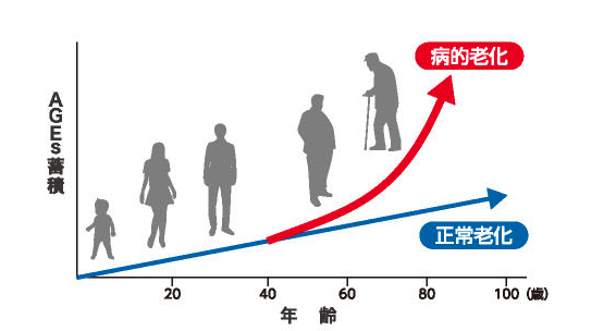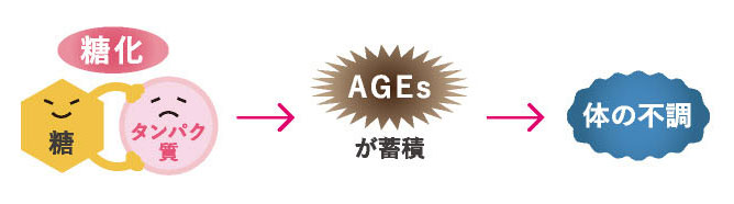 そしてこのAGEs、実は加齢によって基礎代謝が低下するためどんどんカラダに蓄積されてしまうんです。ってことは、もうすでに体内にはある程度のAGEsが溜まっている可能性が…。