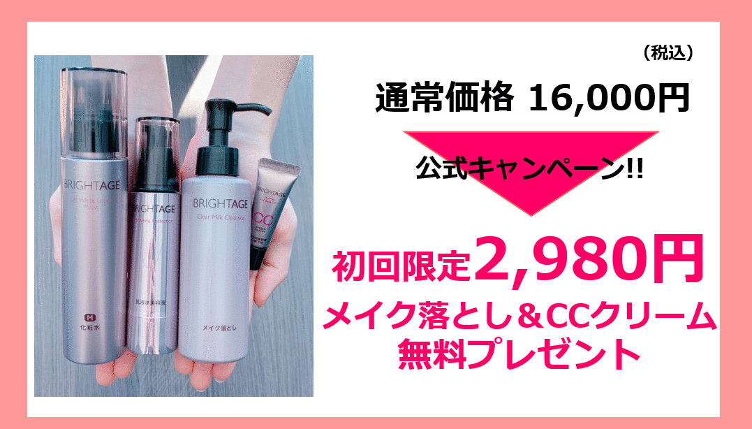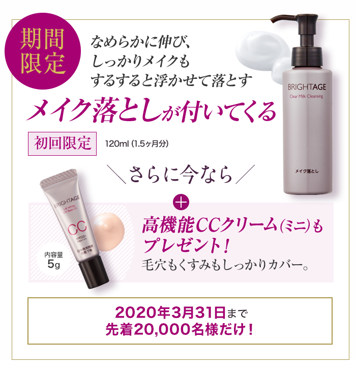 こんなにお得すぎる『ブライトエイジ』ですが、今だけ限定でメイク落とし本品とミニCCクリームが無料でついてくるキャンペーン実施中です!(どちらも医薬部外品)