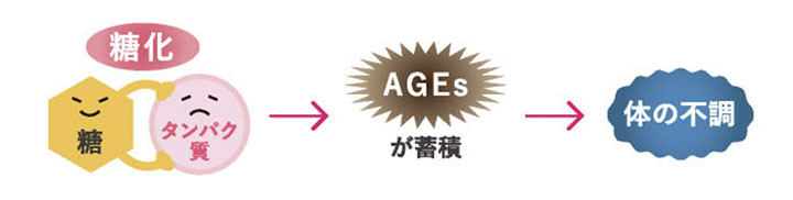 糖化とは、「体内の余分なタンパク質と糖が結びつき、糖化最終生成物「AGEs」を生み出す現象のこと。