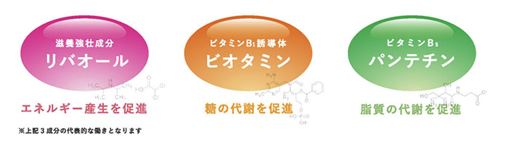 「リバオール」と「ビオタミン」は糖に、「パンテチン」は脂質に働きかけ、それぞれの代謝を促進し、ATP(生命活動の“エネルギー”のこと)の産生をスムーズにします。
