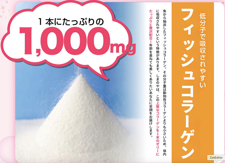普通のコラーゲンより分子が小さく、体に吸収されやすいフィッシュコラーゲン。