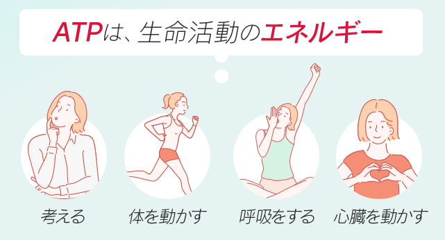 このATPは「運動をする」「呼吸をする」「心臓を動かす」など、人間が生きる上で行う活動全てに活かされるエネルギーです。スムーズに産生されるということは、ATPの総量が増え、体のエネルギー切れが起こりにくくなります。