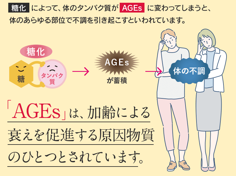 その結果、本来エネルギーとして使われるはずの糖が体内で余り、AGEsという「焦げつき」のような成分を蓄積させてしまうのです。