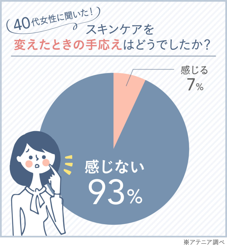実は、40代女性の70%が化粧品の効果を実感しにくくなったと感じ、そのうち93%が化粧品を変えても手応えを感じないそうなんです。