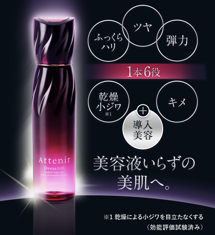 ドレスリフトローションは、ハリ・ツヤ・弾力・乾燥小ジワ・キメ・導入美容の6役を果たす、お役立ち化粧水です。
