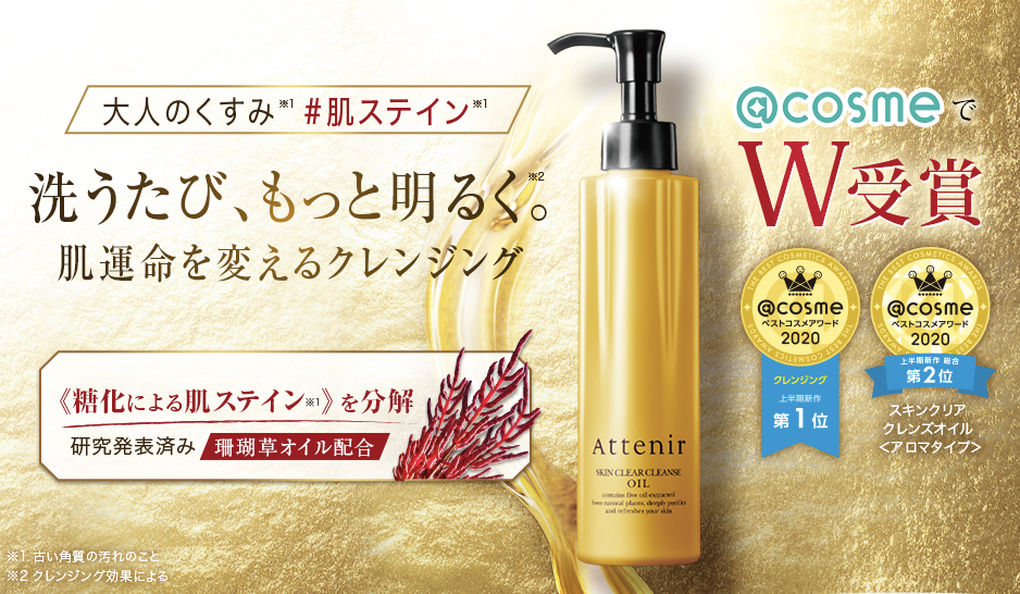 「アテニア スキンクリア クレンズ オイル」なら、毎日の簡単クレンジングで、メイクと一緒にくすみ*の原因「肌ステイン」をすっきりと洗い流して、明るい肌に導いてくれるんです!