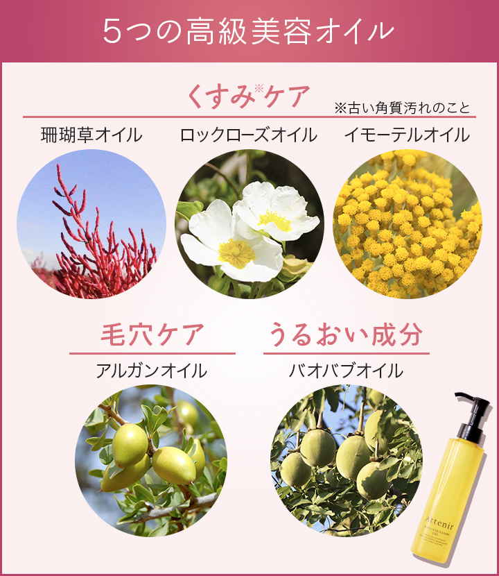 糖化の原因でもある肌ステインを分解してくれる珊瑚草オイル、肌ステインをゆるめてくれるロックローズオイル、毛穴にたまっていく角質を除去してくれるアルガンオイルなどの成分が配合されています!