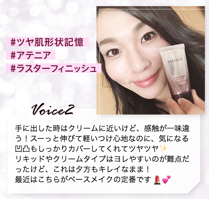 どうしてアテニアのラスターフィニッシュが『ツヤ肌形状記憶ファンデ』と呼ばれているかというと、ファンデーションの粒が表情に合わせて動いてくれるからなんです。 今、「嘘でしょ!?」って思いました(笑)? 私もそう思っていました。 でもこれ、本当に本当の話なんですよ。 その秘密は、ジェルに内包されている「スキントレーサー粒子」が表情の伸縮に沿って動いてくれるから。 さらに!内包されている真珠パウダーがツヤを与えて、オイルのジェルが悩めるデコボコをフラットに整えてくれるんです。 小じわや毛穴と一緒に動くから、化粧くずれを防いだままツヤ肌になれる。しかも1日キープしてくれる。そんな夢のようなファンデーションなんですね♪